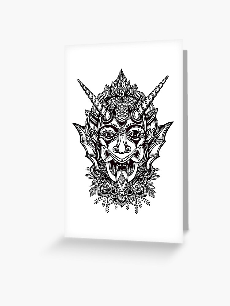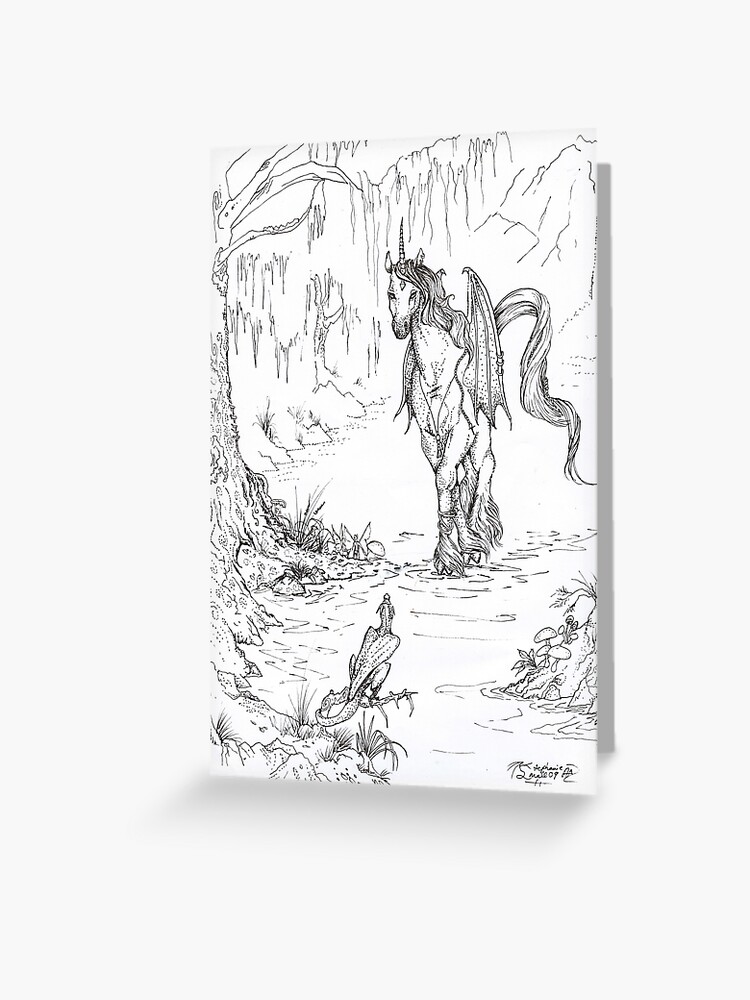 Pen And Ink Unicorn Pegacorn Bat Wings Dragon Greeting Card By